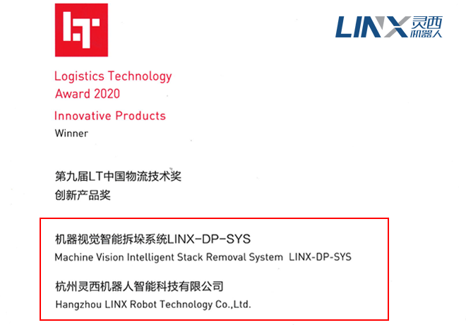 在第九屆LT中國物流技術(shù)獎(jiǎng)?lì)C獎(jiǎng)典禮上,靈西機(jī)器人“機(jī)器視覺智能拆垛系統(tǒng)LINX-DP-SYS”獲得“2020第九屆LT獎(jiǎng)-創(chuàng)新產(chǎn)品獎(jiǎng)”。